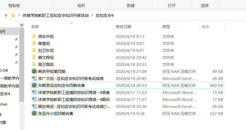 本次活动按校园管理、新型冠状病毒防控基本知识、个人防护和工作区域管理四个部分进行;每两天把一个部分的问答题目发到微信工作群,请各位老师按时完成问答;各位老师在规定时间内将答案发给各自的组长进行评分和统计;各组长将组员的成绩和答卷发按组别给工会汇总留存资料。经过八天的学习历程,体育学院工会圆满地完成该项活动的任务内容。